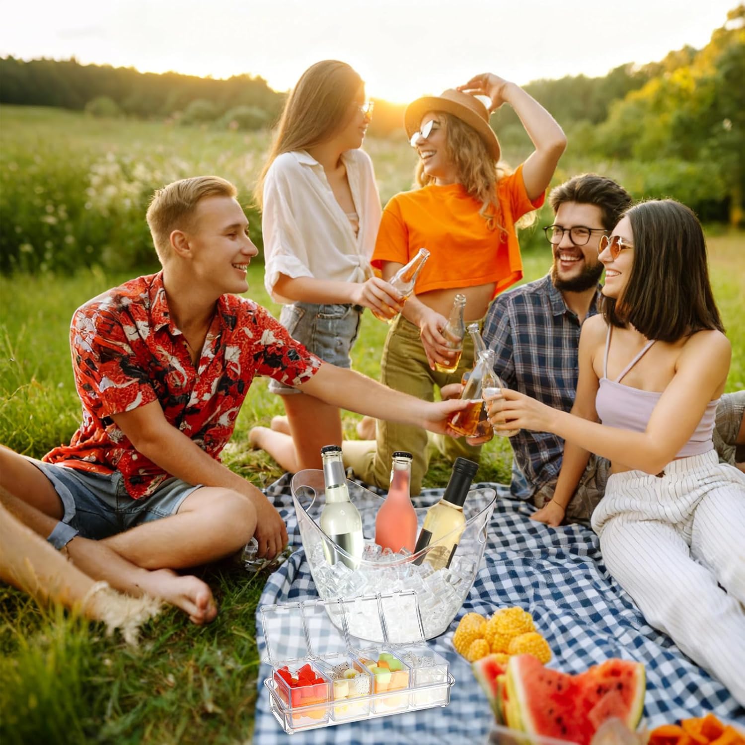 Features: Whether you're hosting a party or just enjoying a meal at home, this versatile condiment server is a great addition to your kitchen. Designed with clear, durable plastic for a full view of your food and ice, this garnish tray is a breeze to clean! Specifications: Material: Champagne Ice Buckets: plastic Condiment Server: acrylic Color: clear Size: Champagne Ice Buckets: about 10.6 x 7.7 inches/ 27 x 19.5 cm Condiment Server: about 10 x 3.5 x 3 inches/ 26 x 9 x 7.5 cm Package includes: 2 x Champagne Ice Bucket 2 x Condiment Server 8 x Spoon Notes: Manual measurement, please allow slight errors on size. The color may exist a slight difference due to different screen displays