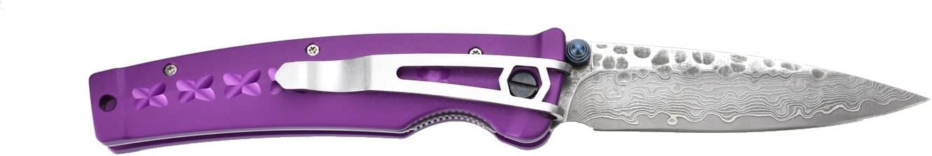 Type: Liner lock; Closed: 4. 25"; Blade: 3. 25" l Damascus Steel. l Standard Edge; Other Info: Thumb Stud(s). Purple anodized aluminum handles with decorative X design etching. Handle is etched Japanese Bush Sword with Mcusta logo. Boxed.