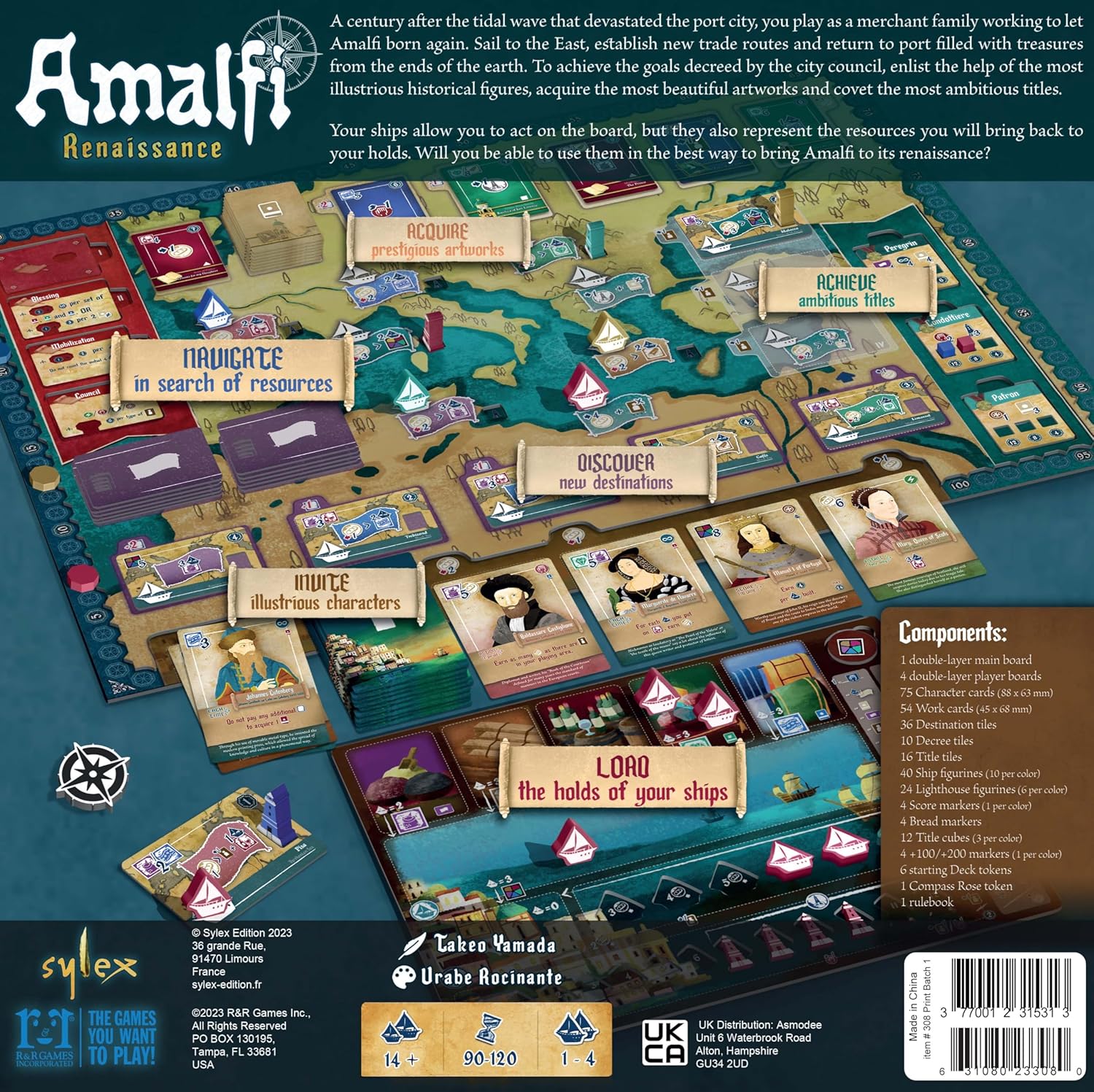 R&R Games: AMALFI RENAISSANCE - Amalfi - Renaissance is a ship placement game in which players use their ships to establish trade routes to return with treasures. Navigate, discover, and acquire as you lead Amalfi to its renaissance. In the 14th century, the once flourishing port town of Amalfi was devastated by a tsunami. This led to a serious decline in wealth and power. As a merchant family, you are eager to rebuild. You will use your small fleet and desire to explore to restore your homeland’s greatness. A century after the tidal wave that devastated this port city, you play as a merchant family working to help Amalfi to be reborn. Sail to the East, establish new trade routes and return to port filled with treasures from the ends of the earth. To achieve the goals decreed by the city council, enlist the help of the most illustrious historical figures, acquire the most beautiful artworks and gain the most ambitious titles. Your ships allow you to act on the board, but they also represent the resources you will bring back to your holds. Will you be able to use them in the best way to bring Amalfi to its renaissance? For ages 14+, 1-4 Players, 90-120 Min.